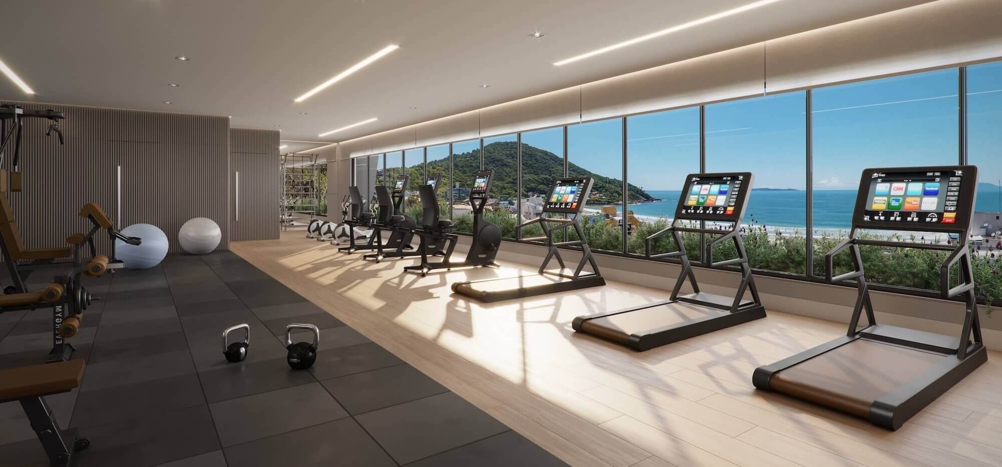Academia ampla, com vista para o mar e equipada